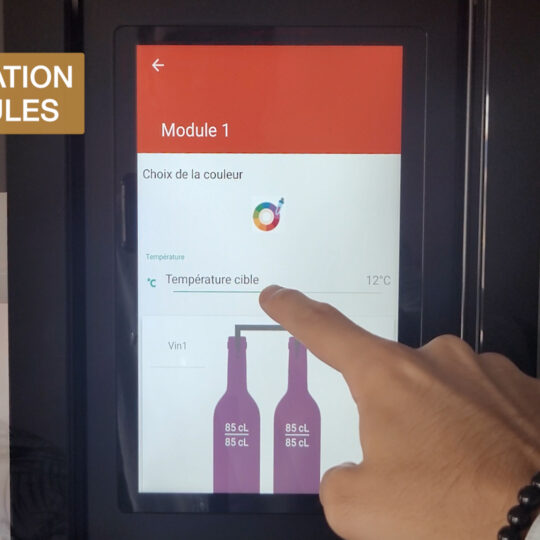 Le menu Configuration des modules permet d’ajuster l’éclairage et la température de chaque compartiment afin d’adapter la présentation et la conservation du vin.
