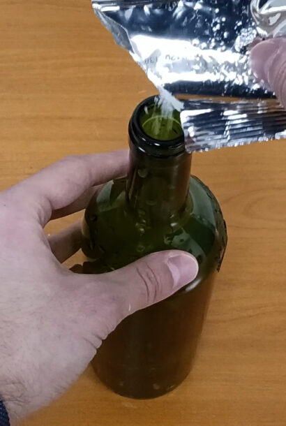 - Dans la première bouteille, versez la dosette d’acide citrique.